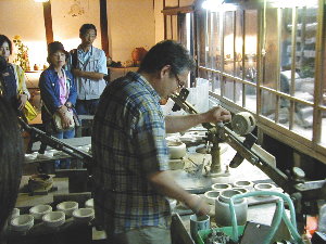 皆さん真剣に四代目の絵付けの苦労話や道具の話に耳を傾けます。 いよいよ実演。 周りを取り囲まれてちょっと緊張されているご様子でした。 |